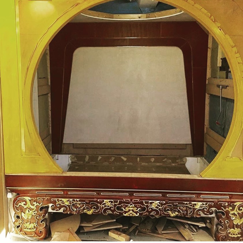 A Chinese cinema rises from the sea next to a coastal city. The screen, flanked by two lanterns, shows Venice, Marco Polo’s homeland far away.  Buddha observes quietly. Stars burst into the sky.