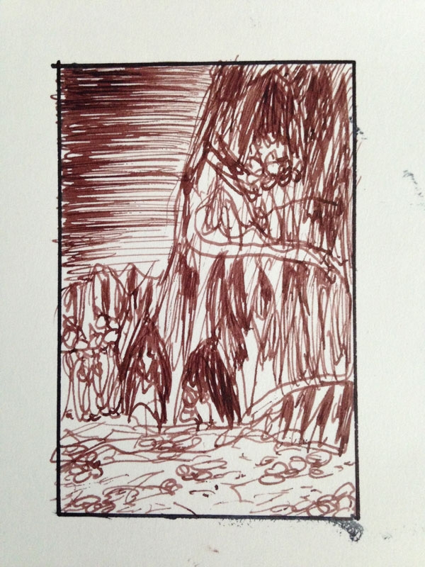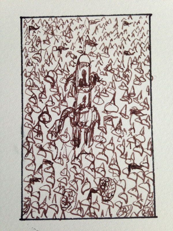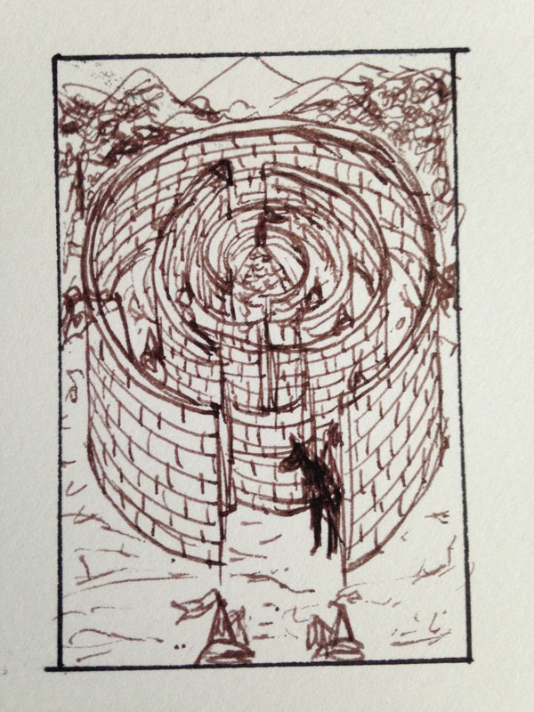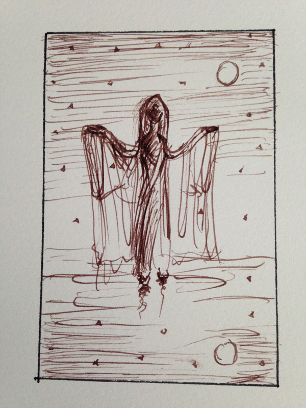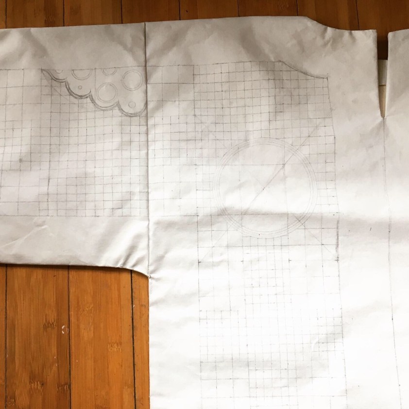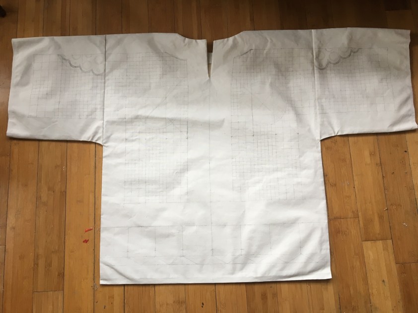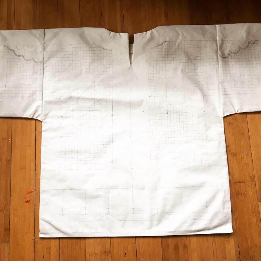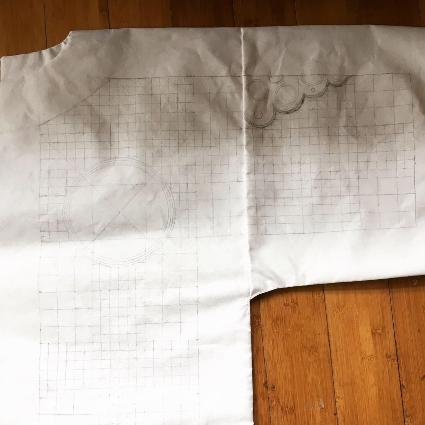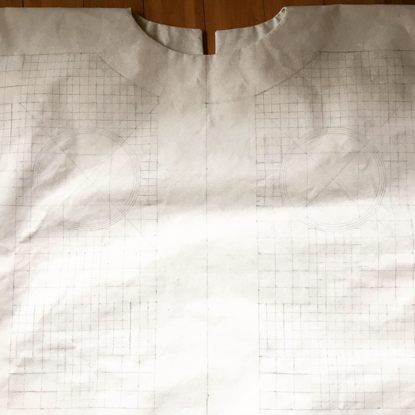 Once a painter, always a painter: this will be paint on fabric, also in the tradition of talismanic shirts. It will be painted on primed canvas that has been stitched into a shirt, so bringing the painting away from the wall and onto an object (2 dimensions when flat, 3 dimensions when worn… 4 and 5 dimensions when the tradition of these shirts and the spiritual protection are taken into account!)