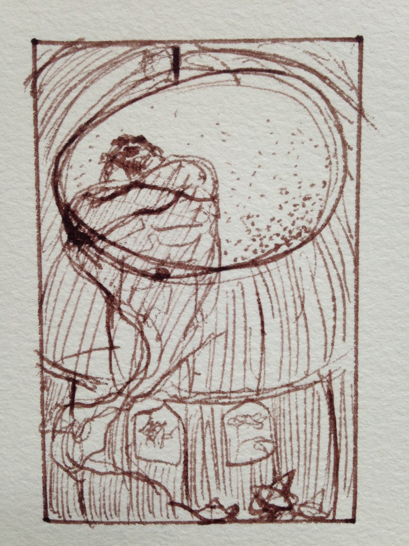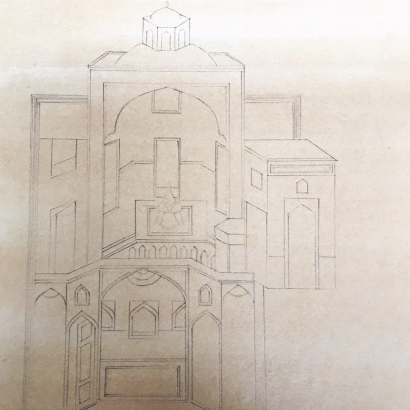 When tracing it comes out the opposite way. I wanted this. I wanted both ways as this mirroring reflects the myriad ways the stories of the 1001 Nights echo each other, so I’m playing with several versions of the same traced building with rooms within rooms, several different spaces and planes and multiple perspectives of which I am always a fan. Like the rhizome, several centres, no privileged viewpoint ~