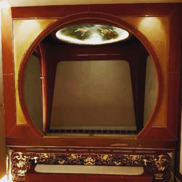 All my husband’s hard work including his contemporary take on the moon gate frame and leather, brass, suede and gold! I did the revolving dome inside and have yet to paint the last bit of patterns on the side of the bed frames