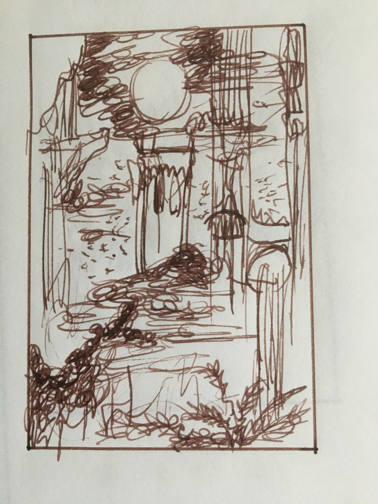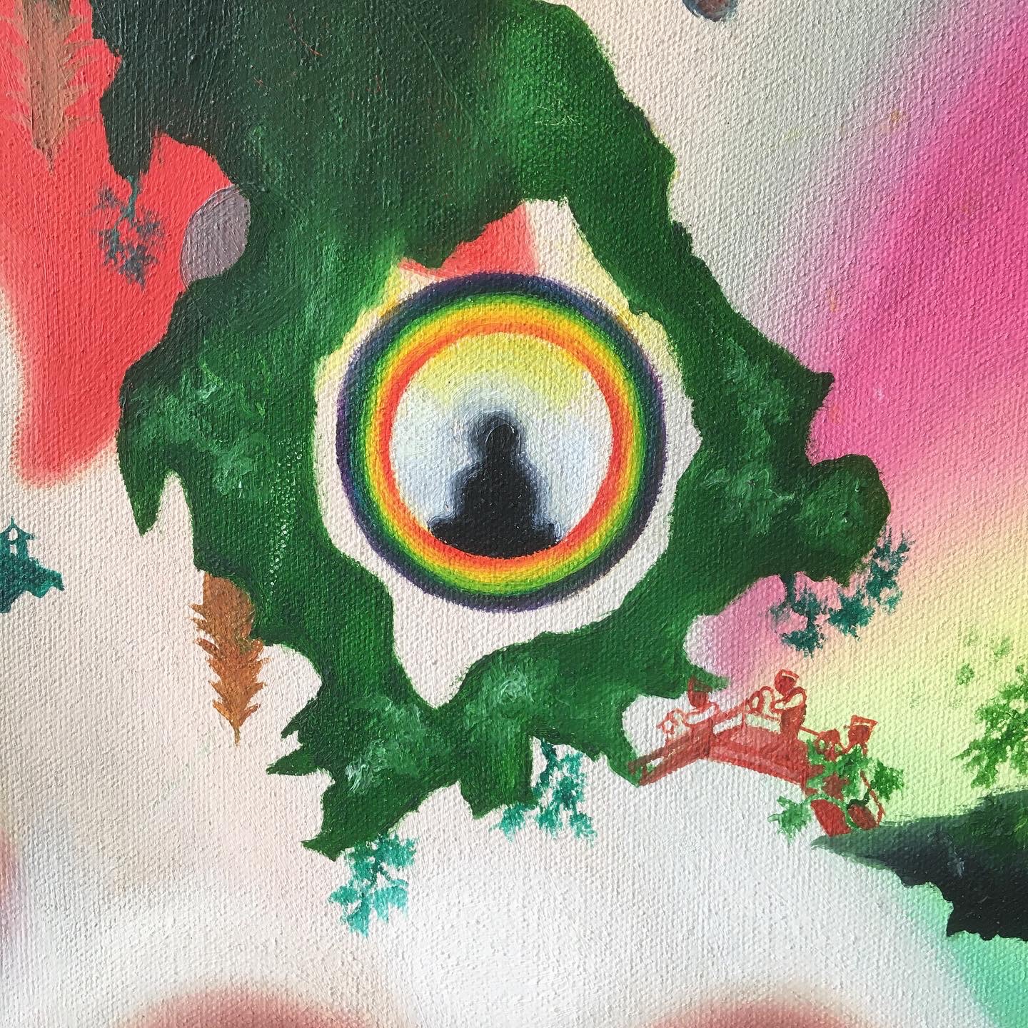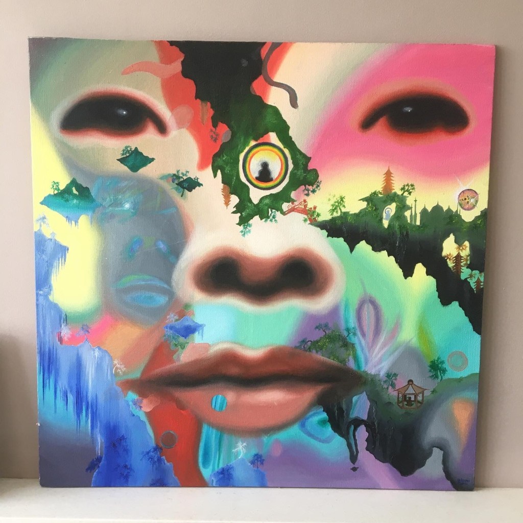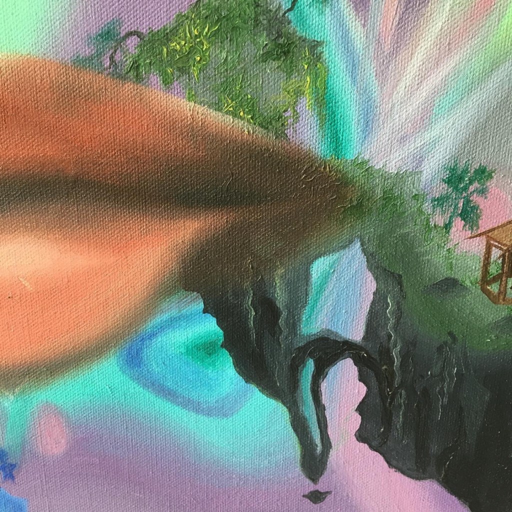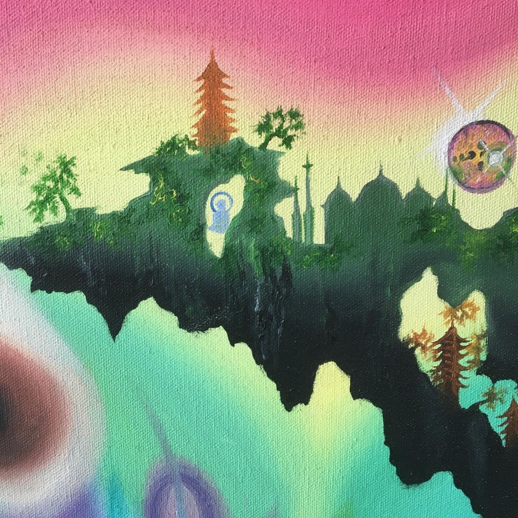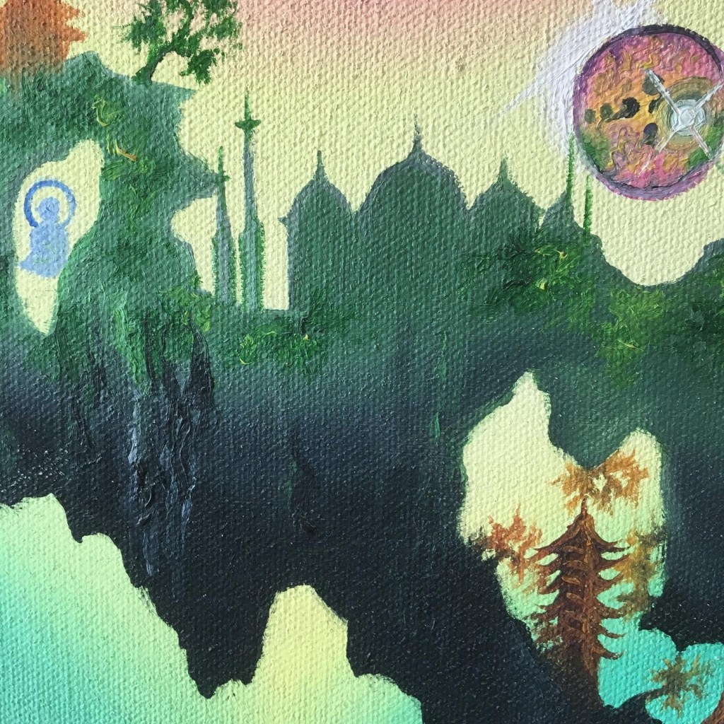 Painting I did in my teens. Forgot the title (as is a teenage work, not part of my properadult art portfolio)! Obsession with floating islands, strange landscapes, onion domes, levitating Buddhas and random pagodas already