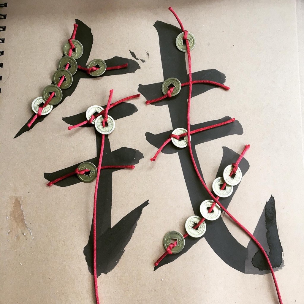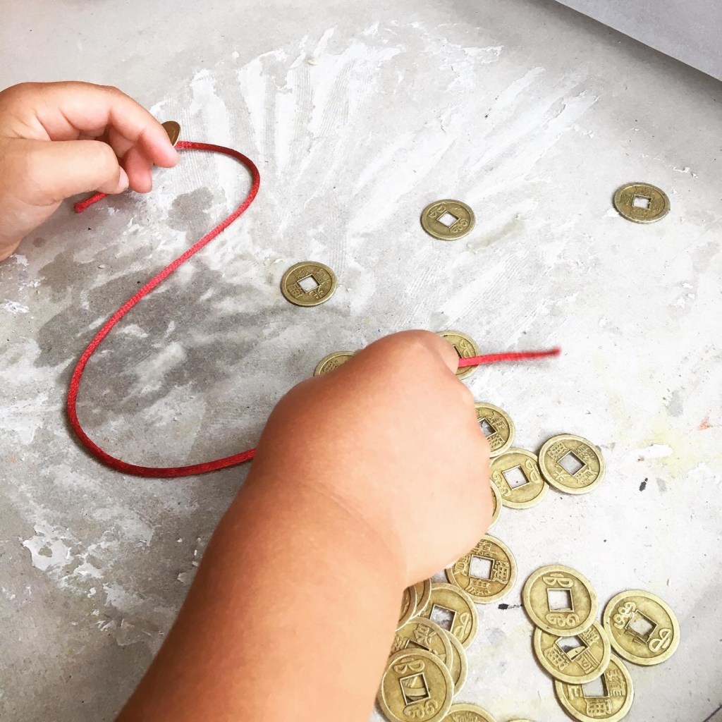 FISH First step was to look in wonder at our paddling pool (now a temporary pond) because a fairy had left some (artificial) old Chinese coins there overnight, so fished for them THREAD Threading (fine motor skills, cultural awareness and fact that old coins have holes in them specifically for threading – also, the square in the circle ⭕️ profound symbol but maybe that’s for later) to make the Chinese character 钱qian money (older kids can knot coins into patterns) COUNT Figuring out how many coins make up the strokes (so, bigger number for the longer strokes etc) and sticking in correct stroke order (always) WINGing it because maths not my strong point but am sure just counting is fine for now (other tips welcome) RUB Once stuck down did brass rubbing kind of in correct stroke order (I loved making rubbings as a kid)