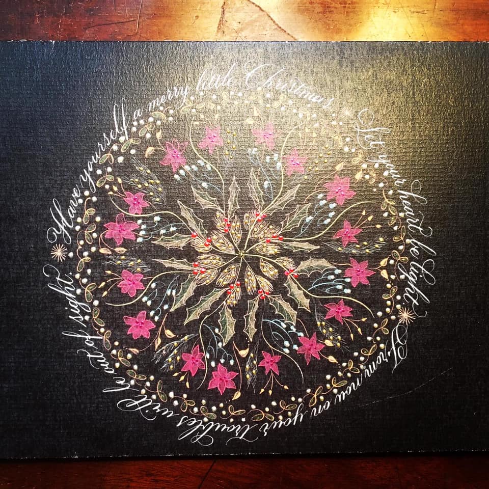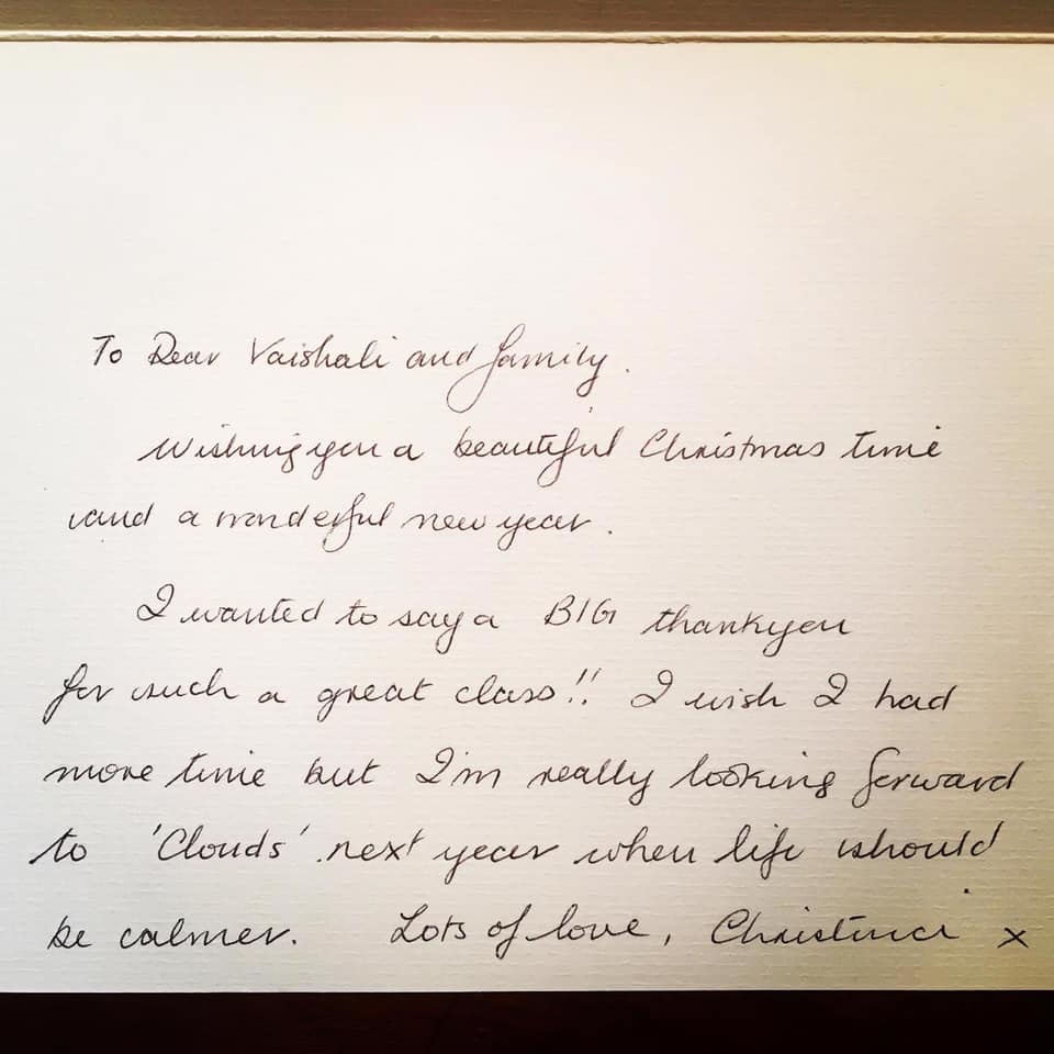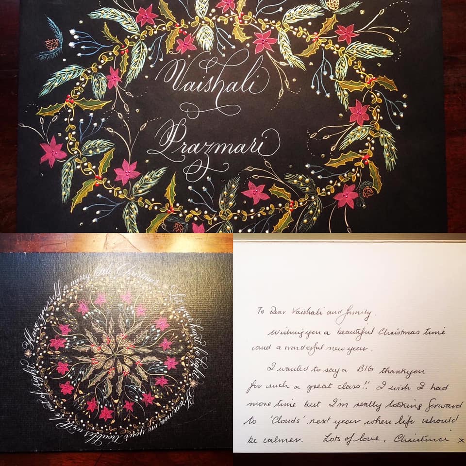 ‘Tis the season to start thinking about Christmas cards. I love calligraphy and calligraphers. The two combine beautifully in this perfect Christmas card I got out again from my student Christina Janoszka Christina Anna Janoszka – she’s a brilliant calligrapher and makes wonderful handmade cards for all seasons as well as many other bespoke products. I believe in small business and supporting the self-employed, artisanal companies that drive creativity in this country and in the world. She’s a really talented lettering artist who has mastered the difficult copperplate pointed pen style and her writing flows with ease and beauty. It’s such a pleasure to receive something elegantly handwritten that you know someone has taken time and thought to write. Even her ‘normal’ handwriting is neat and beautiful! (Unlike mine!) Commission calligraphy this Christmas, it is such a joy to give and receive.