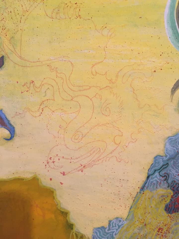 He did a fairly good job. Painted outside the lines a little which is to be expected. I will tidy up his work but for the most part keep it. Maybe next time I’ll teach him to layer things and he can learn some skill. He was desperate to help his mama and insisted on painting ON my painting. I don’t always allow; this time I did. Better that he does it under my watch than behind my back. The thrill it gave him was immense…and it was fine in the end. And he can look back on it and point out ‘I did that part!’ Let kids paint, collaborate with kids!